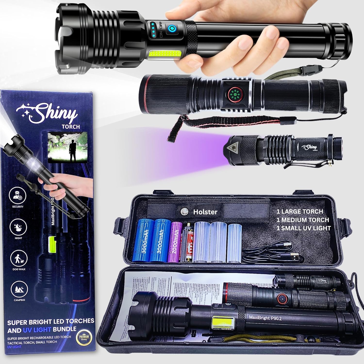 MaxiBright P90.2 Flashlight Bundle: Super Bright LED Rechargeable Torches - 3 Torches - large - small - extra small - LED & UV Light - For Work & Adventures
